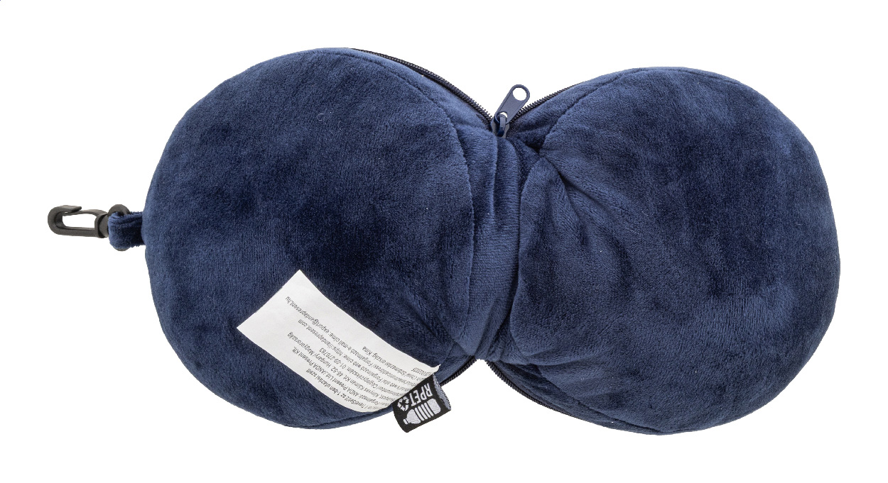 Reisekissen aus RPET-Polyester mit integrierter Augenmaske und elastischen Bändern. Lässt sich dank Reißverschluss zu einer kompakten Kugel zusammenfalten und ist mit einem PP-Karabiner zur Befestigung am Gepäck ausgestattet. Mit RPET-label.