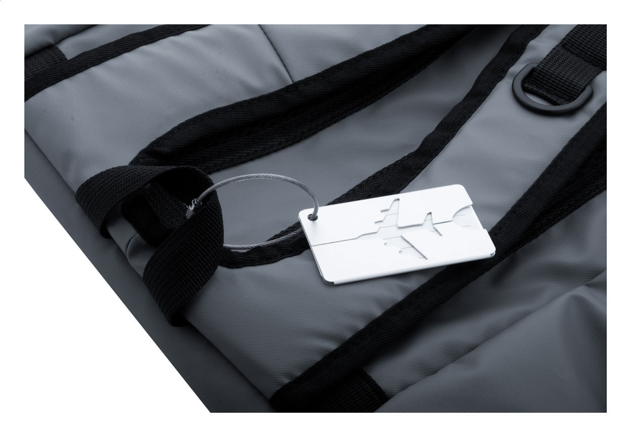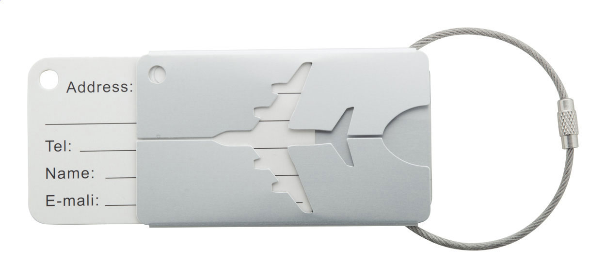 Kofferanhänger mit Flugzeugmotiv aus Aluminium und Schnur aus Metall.