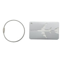 Kofferanhänger mit Flugzeugmotiv aus Aluminium und Schnur aus Metall.
