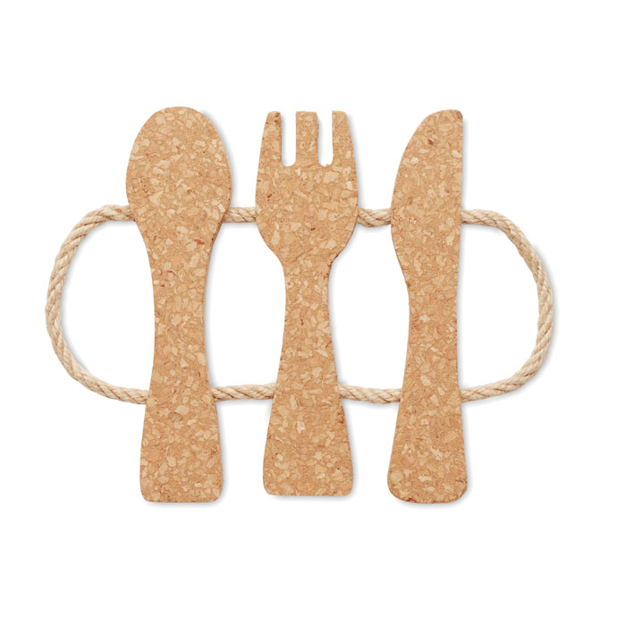 Topfuntersetzer im Design von Besteck. Kork mit Jute-Kordel.
