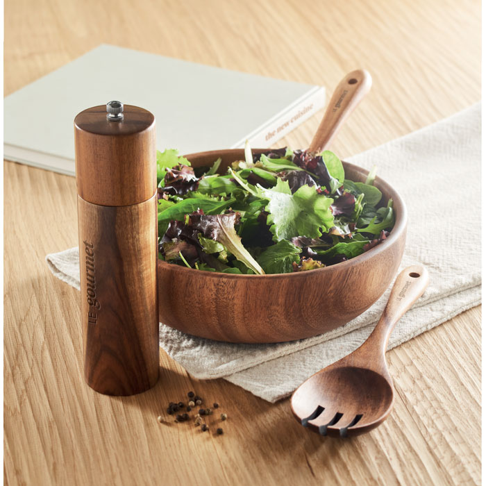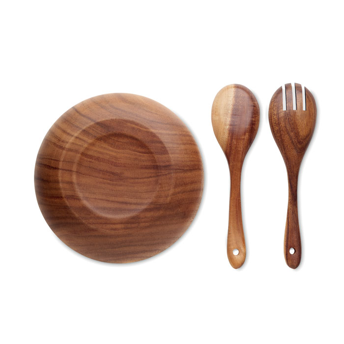 Salatschüssel aus Akazienholz mit passendem Salatbesteck.
