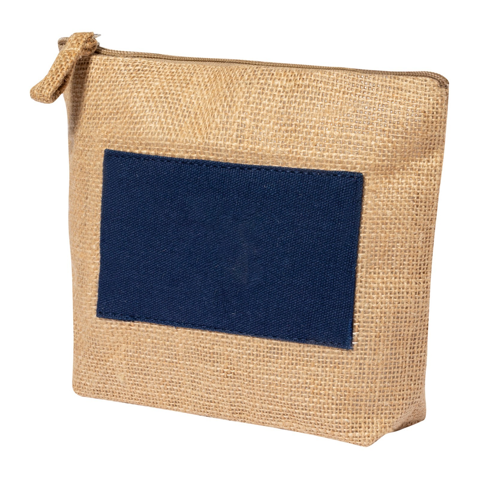 Reißverschluss-Kosmetiktasche aus laminierter Jute und Baumwolle.