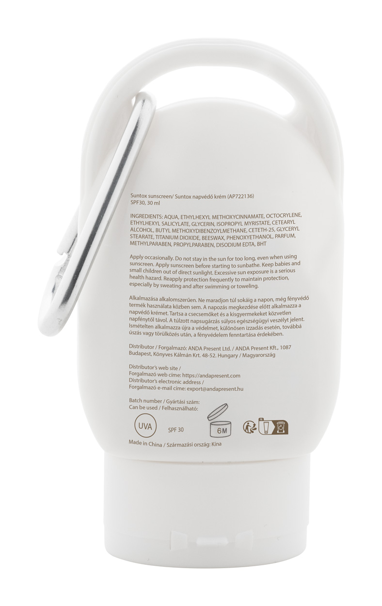 Sonnencreme im Kunststoffbehälter mit farblich abgestimmtem Deckel und Karabiner. SPF: 30. Inhalt: 30 ml