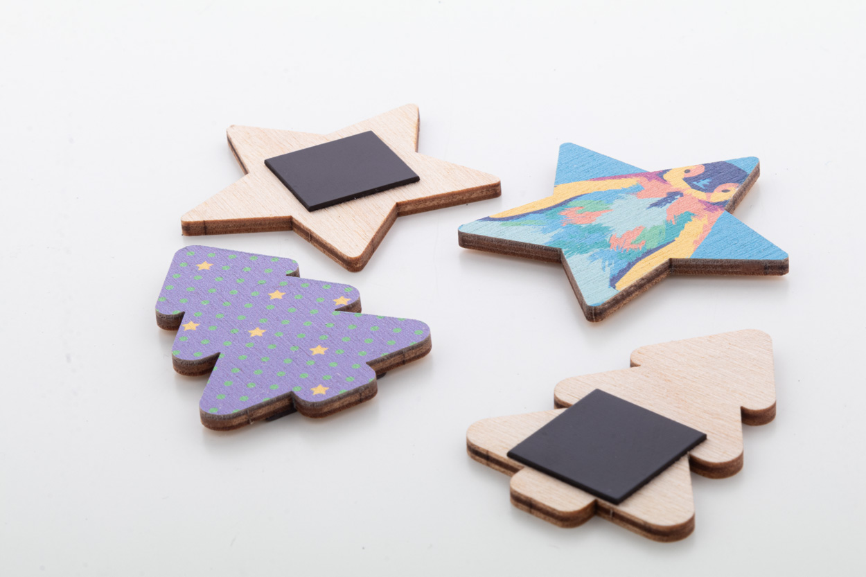 Individueller Weihnachts-Kühlschrankmagnet aus Birkensperrholz mit vollfarbiger Bedruckung. Der Preis ist inkl. UV-LED-Druck. Mindestmenge: 200 Stk.