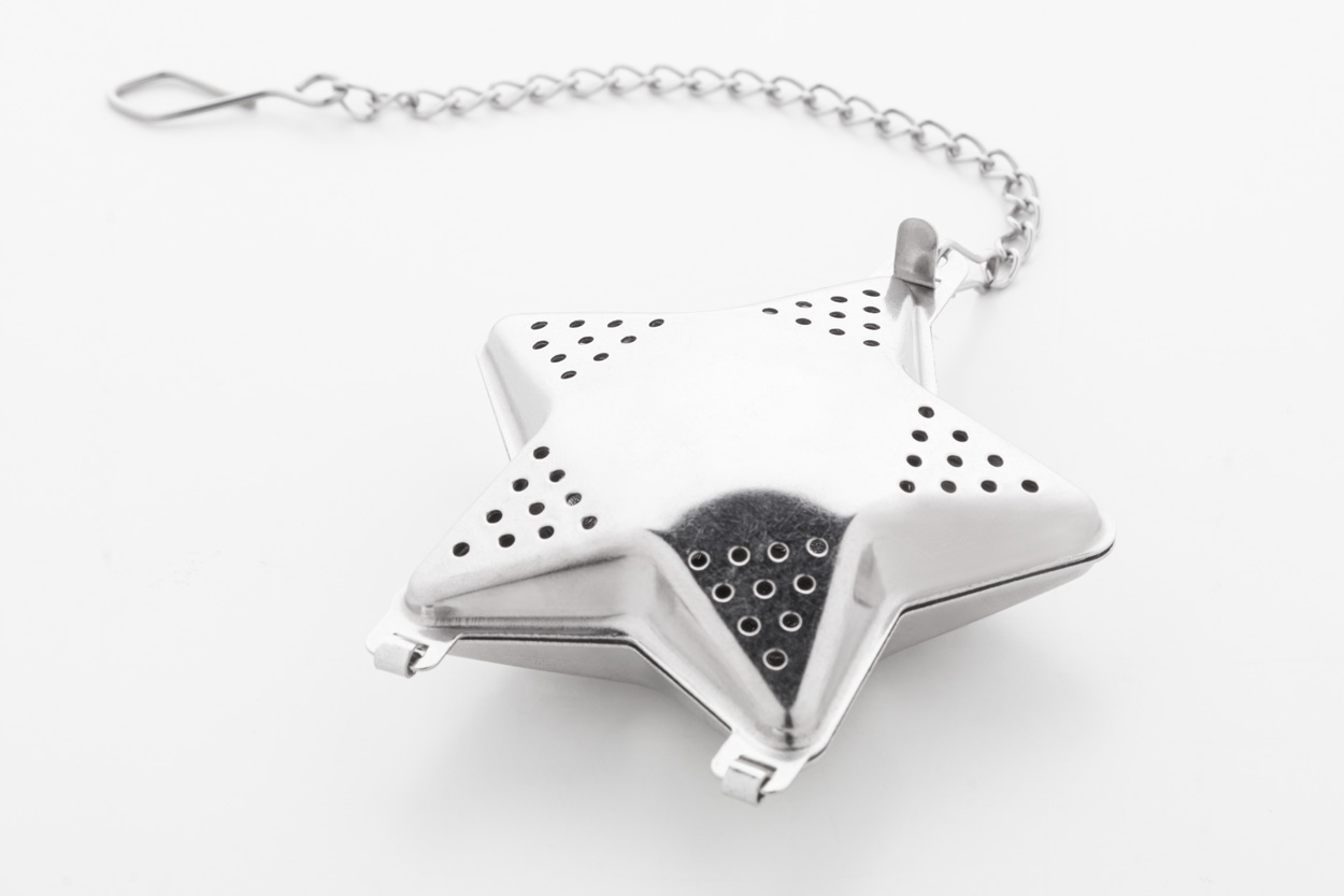 Weihnachts-Tee-Ei aus Edelstahl mit Kette und Clip und bedruckbarer Fläche auf einer Seite.