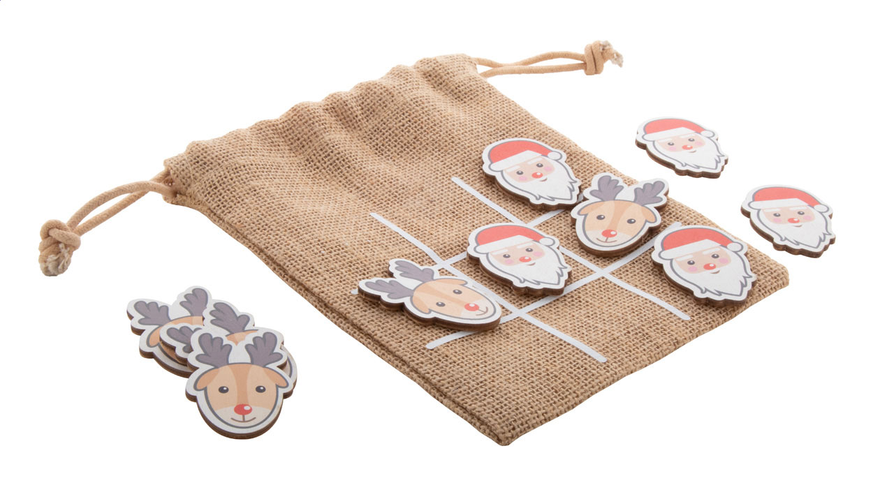 Tic-Tac-Toe-Spiel in weihnachtlichem Design aus Birkensperrholz mit 10 Spielsteinen und Jutesäckchen.