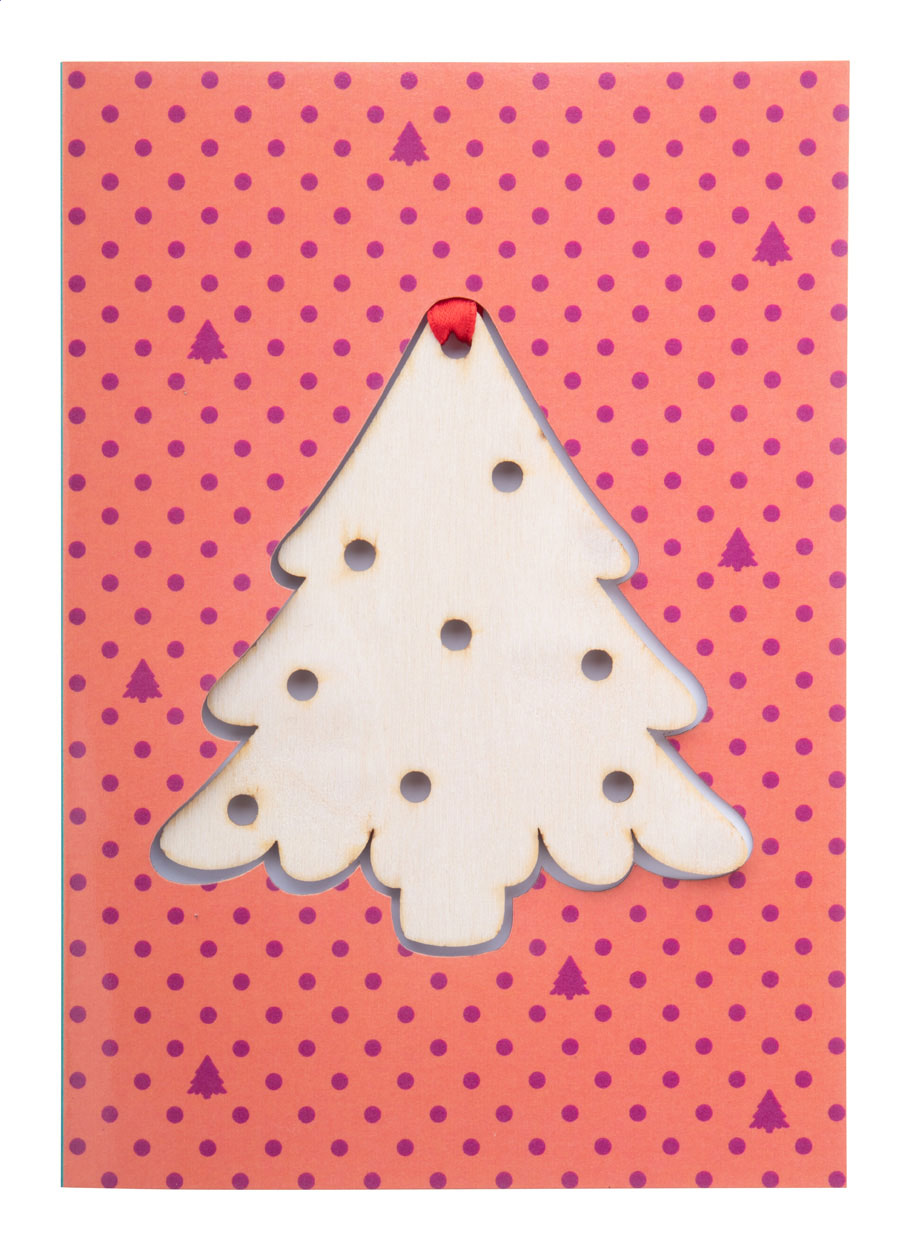 Individuelle Weihnachtskarte mit Weihnachtsbaumschmuck aus Sperrholz mit roter Schleife. Der Preis ist inklusive Vollfarbdruck auf beiden Seiten der Karte. Inkl. C6 Briefumschlag. Mindestmenge: 100 Stk.