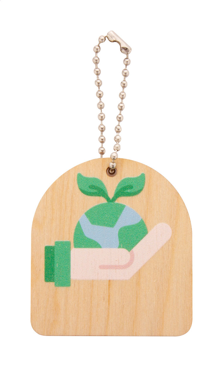Schlüsselanhänger aus Birkensperrholz mit Metallschlüsselring und Umweltschutzmotiv.