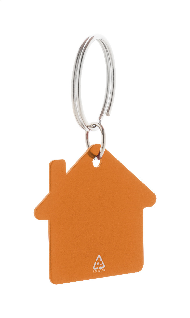 Schlüsselanhänger aus recyceltem Aluminium in Hausform mit Metallring.