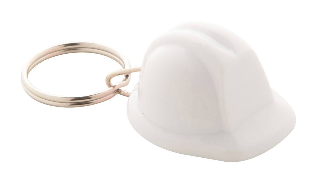 Schlüsselanhänger in Form eines Sicherheitshelmes aus Kunststoff.