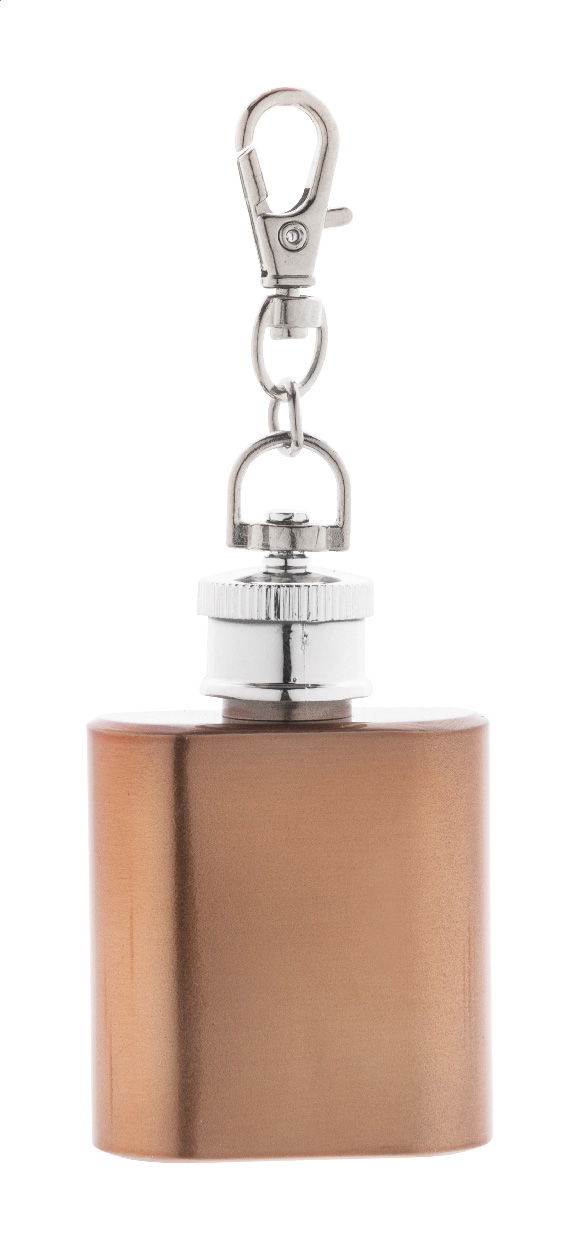 Mini-Flachmann aus recyceltem Edelstahl mit glänzendem Metallic-Oberfläche und Karabiner-Schlüsselring. Füllmenge: 30 ml.