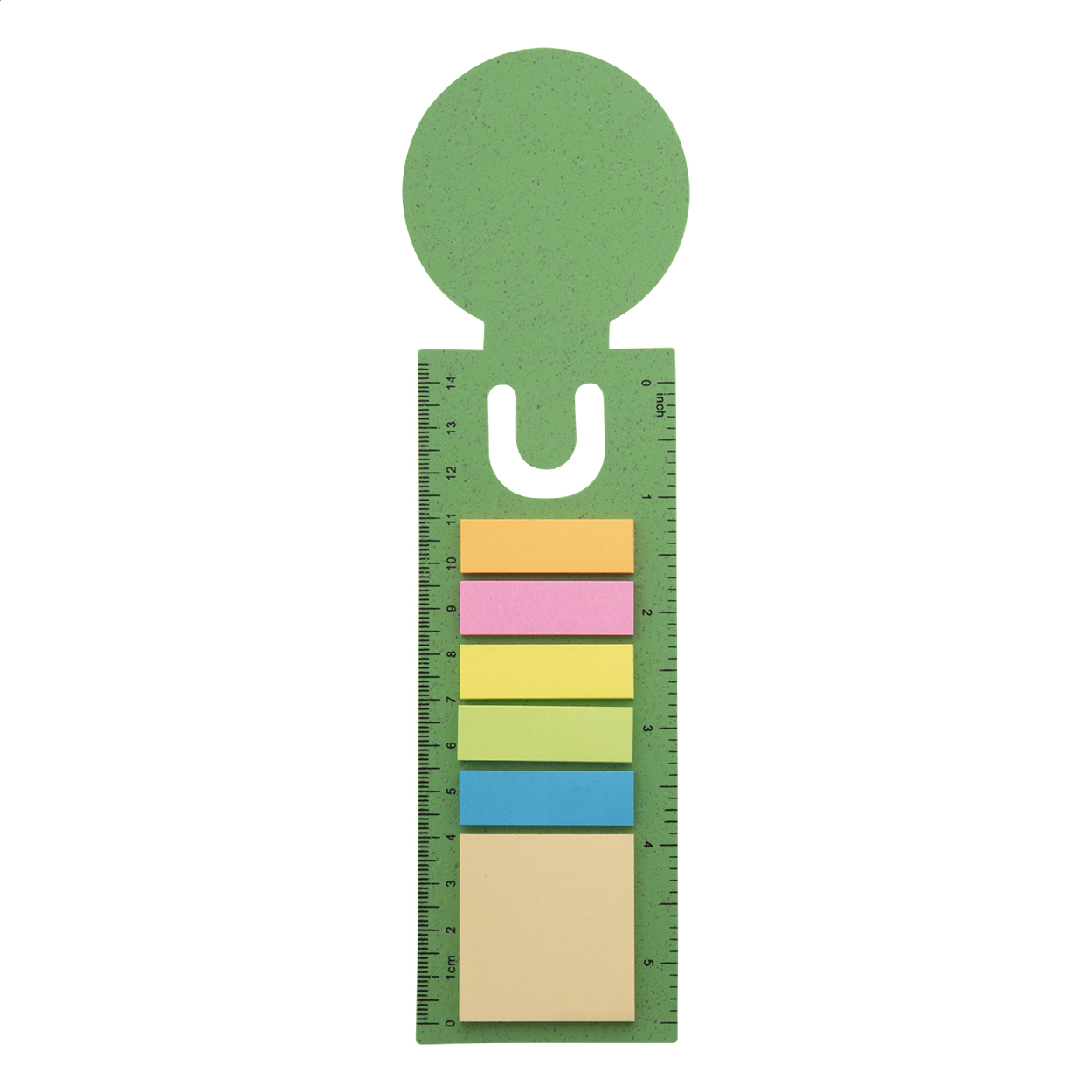 Ökologisches Lesezeichen und Lineal aus Weizenstroh-Kunststoff mit 25 Haftnotizen und 125 Seitenmarkern (in 5 verschiedenen Farben).