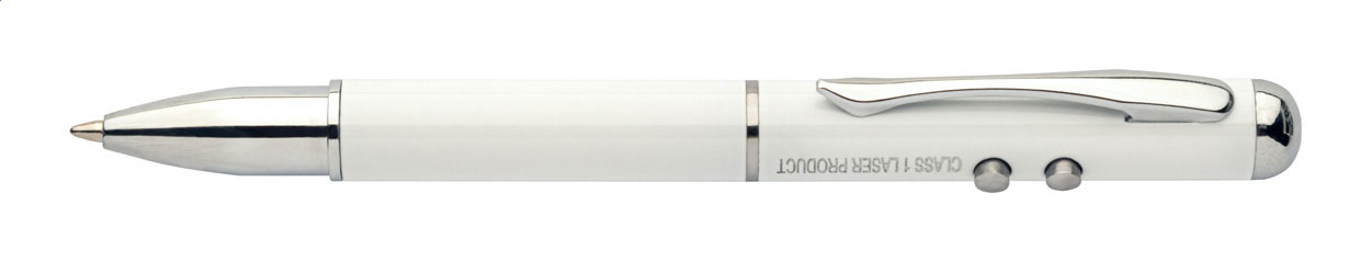 Multifunktions-Laserpointer mit Kugelschreiber, Touchpen und LED-Taschenlampe (inkl. Knopfzellenbatterien), blauschreibend. Einzeln in Metall-Geschenkbox.