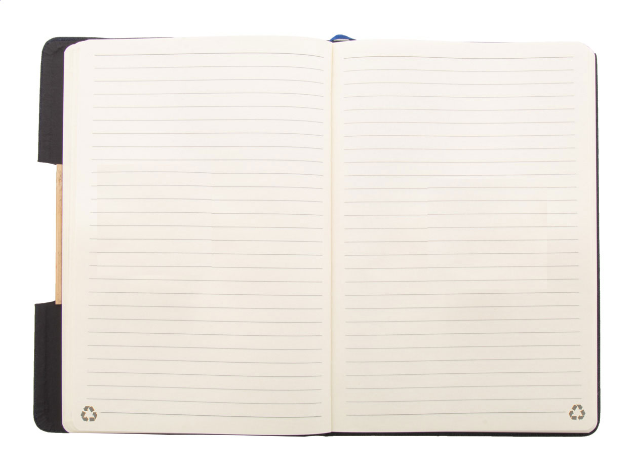 A5 Notizbuch mit Umschlag aus RPET Polyester und Bambuseinlage, Handyhalterfunktion, 80 linierten Seiten aus Recyclingpapier und Gummiband.