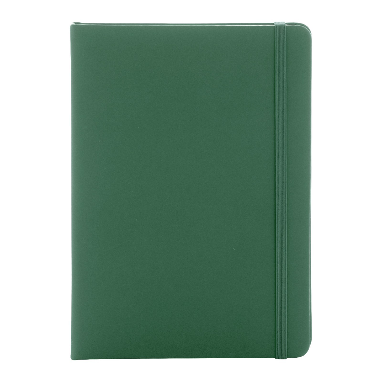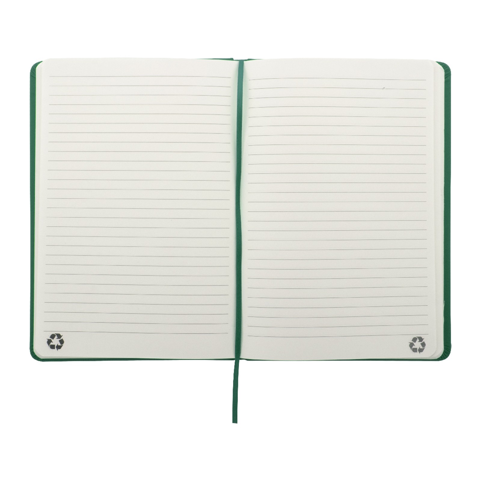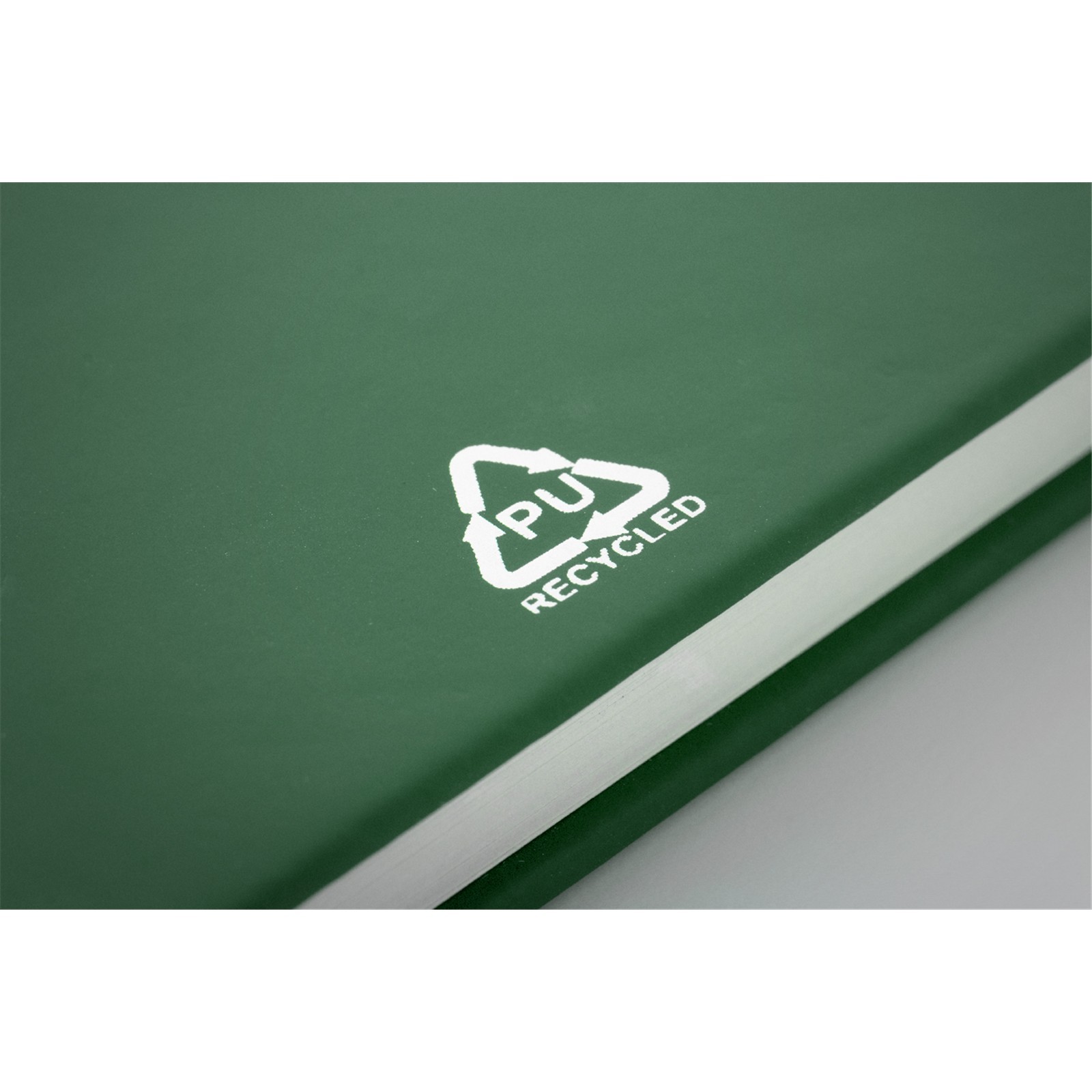 Notizbuch mit recyceltem PU-Lederbezug und 100 linierten Blättern aus Recyclingpapier. Mit farblich passendem Lesezeichen und Gummiband. A5-Größe.