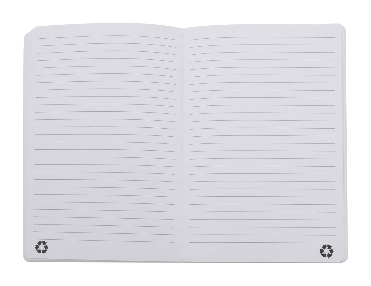 A5 Notizbuch aus recyceltem Kunstleder mit Softcover und 80 linierten Seiten aus Recyclingpapier. Mit farblich abgestimmten Lesezeichen und Gummiband.