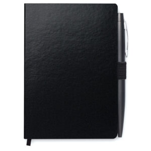 DIN A6 Notizbuch mit Hard Cover aus PU und 72 Blatt (144 Seiten) liniertem Papier. Elastisches Verschlussband und Lesebändchen. Mit passendem Druckkugelschreiber aus Metall. Blaue Tinte.