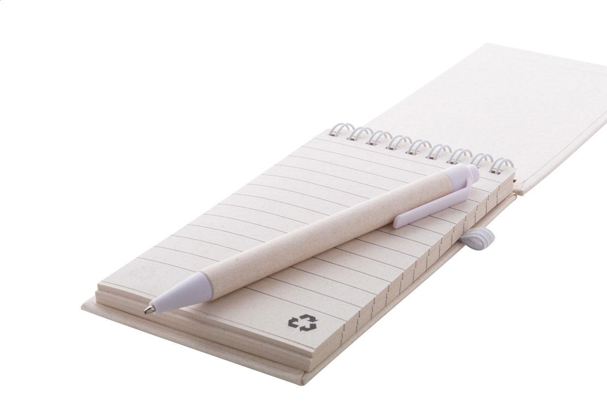 A6 Spiral-Notizblock aus recyceltem Milchkarton mit Hardcover, 70 linierten Seiten, farblich abgestimmten Spiralringen, Gummiband und Stifteschlaufe sowie Kugelschreiber aus recyceltem Milchkarton und recyceltem ABS Kunststoff. Blauschreibend.
