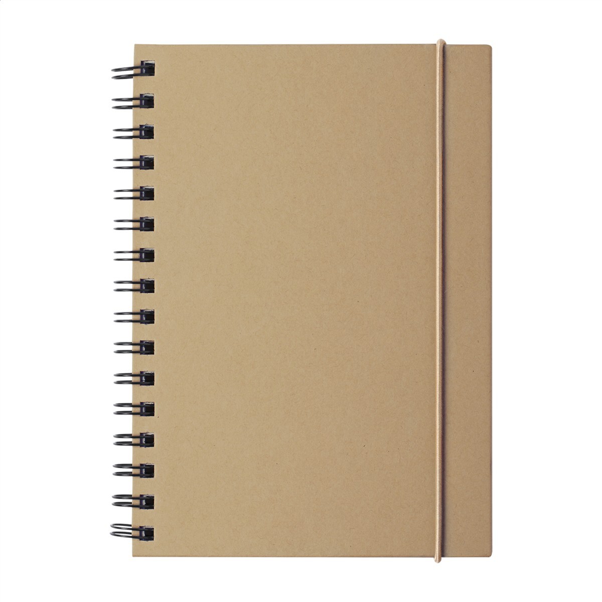 Spiral-Notizbuch aus recyceltem Karton mit Gummiband. 80 linierte Seiten, Größe A5.