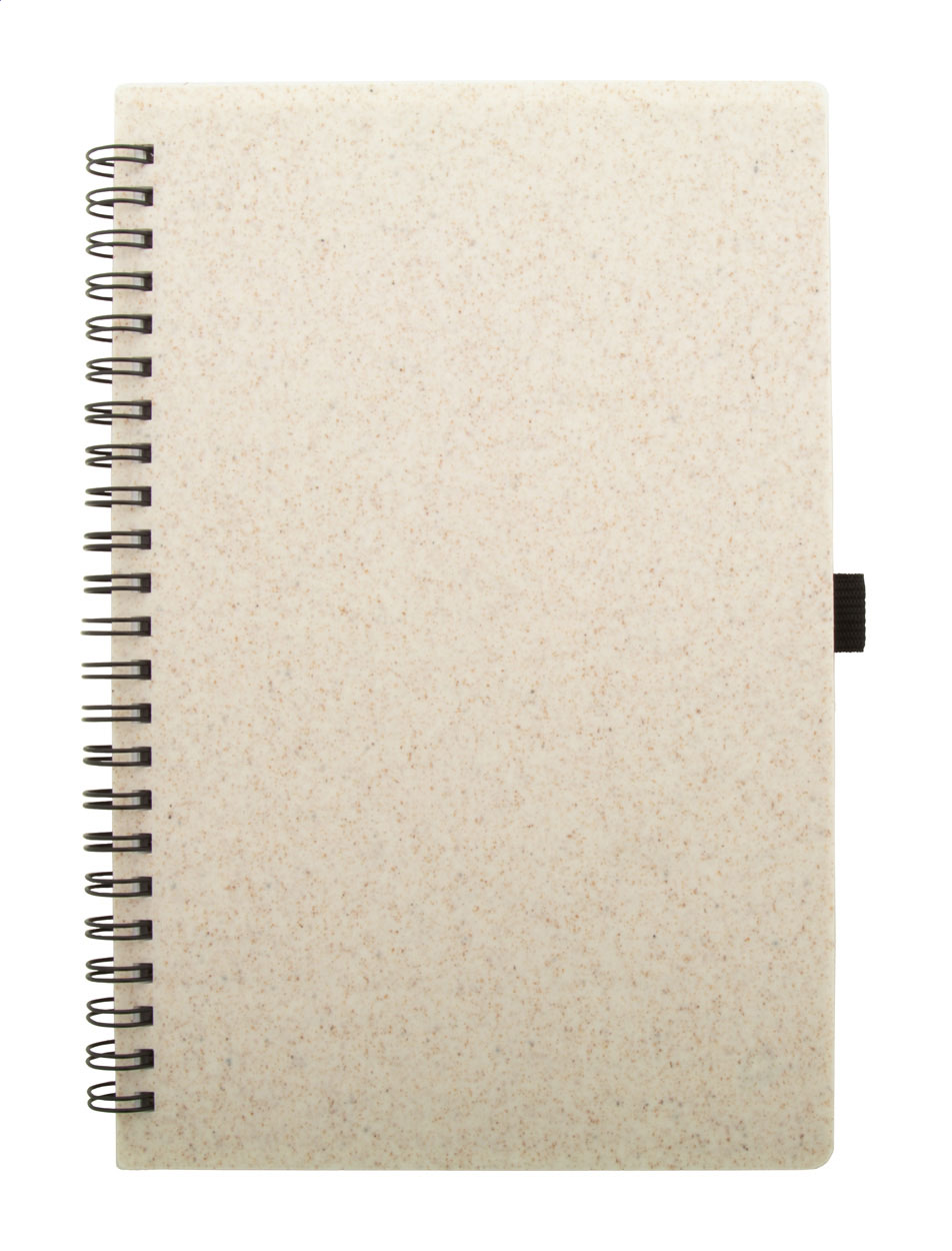 Ökologisches Spiral-Notizbuch mit Weizenstroh-Kunststoffüberzug, 70 linierten Blättern aus Recyclingpapier und Stifthalter im A5-Format.