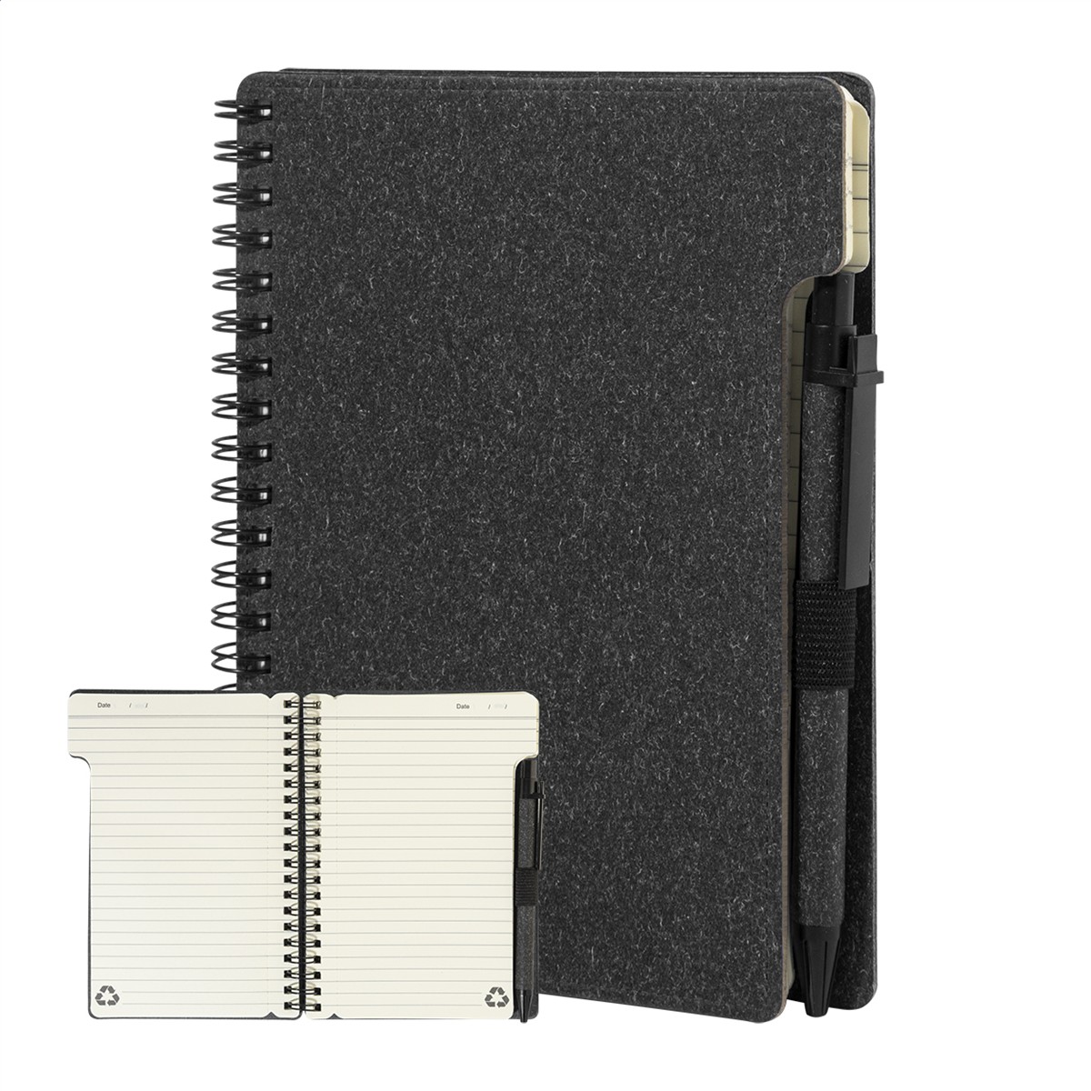 Spiralnotizbuch aus Recyclingpapier mit 80 Blättern (liniert). Format A6. Inklusive Recyclingpapier und Kugelschreiber aus Recycling-PP, blauschreibend.