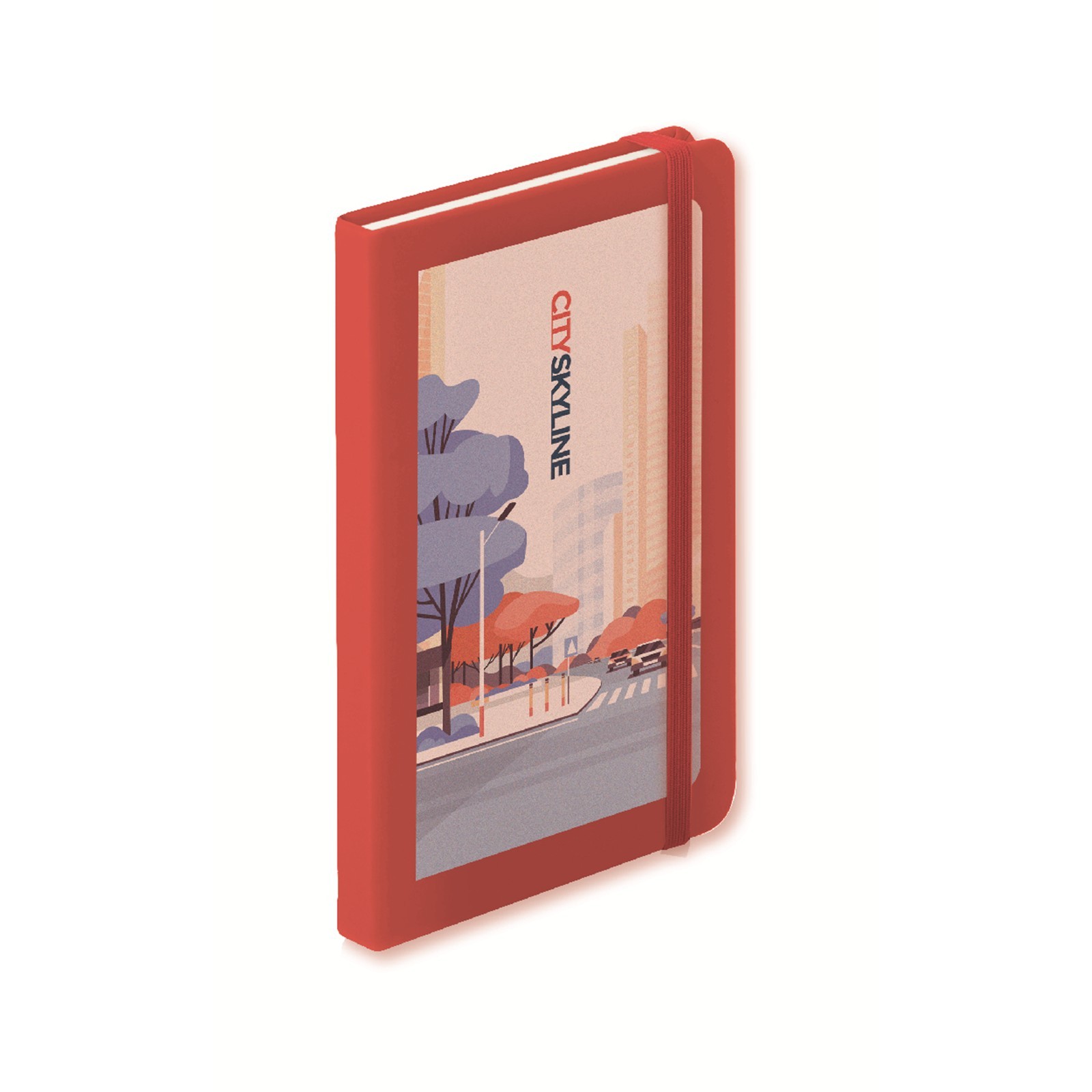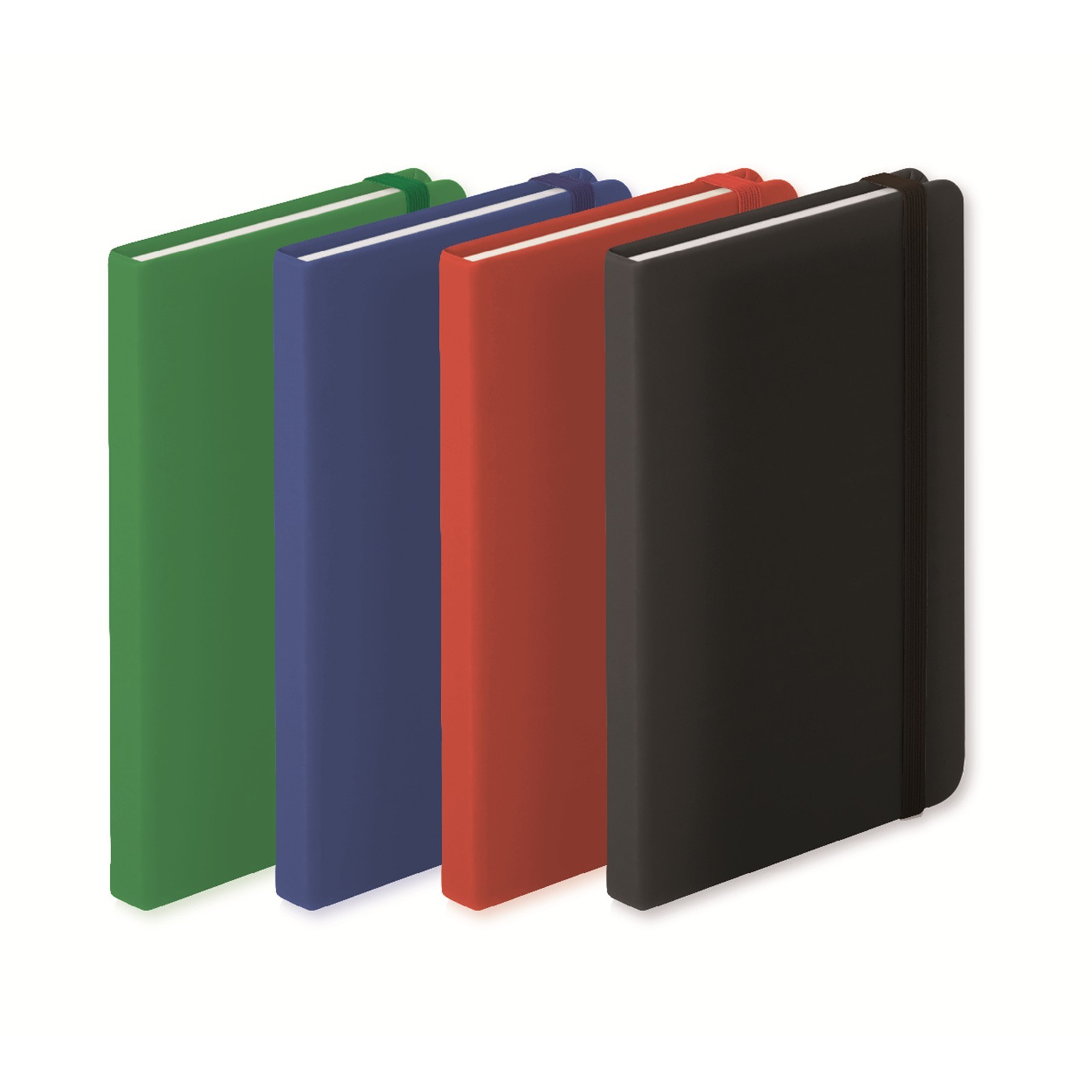 Notizbuch mit Kunstleder-Einband, 100 Seiten (liniert) mit Lesezeichen und Gummiband. A6-Größe.