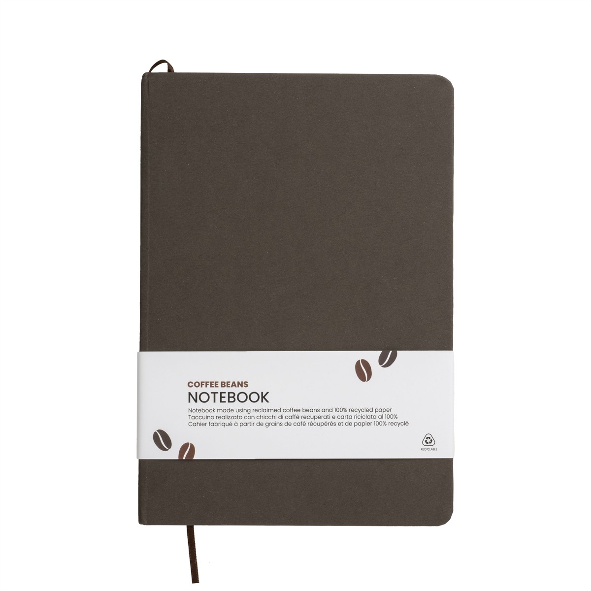 Notizbuch mit Einband aus Kaffeebohnen-, Kirsch-, Lavendel-, Zitronen-, Mais- und Kiwi-Resten. Gestreifte Blätter auf elfenbeinfarbenem Recyclingpapier (80 Seiten), elastischer Verschluss und passendes Lesezeichen aus Satin