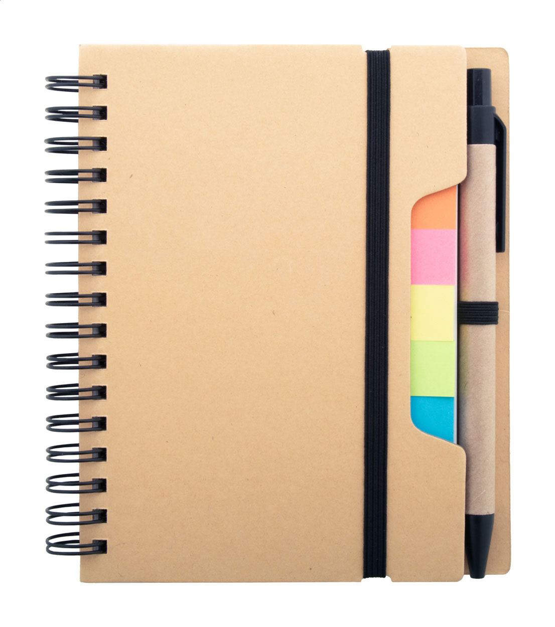 Spiralnotizbuch aus Recyclingpapier mit 70 linierten Blättern und 125 Seitenmarkern (in 5 verschiedenen Farben). Mit Gummiband und Stifthalter. A6-Größe. Inkl. Kugelschreiber aus Recyclingpapier, blauschreibend.