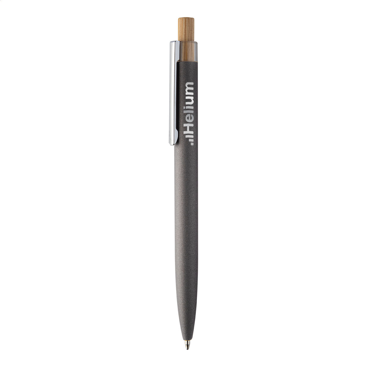 Kugelschreiber aus recyceltem Aluminium mit gummierter Oberfläche, Bambusdrücker und Chromclip. Mit Spezialbeschichtung für eine Spiegellasergravur, blauerschreibend.