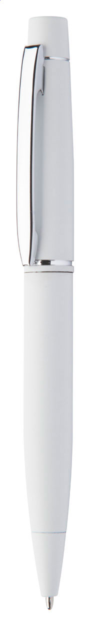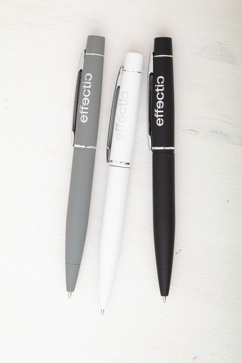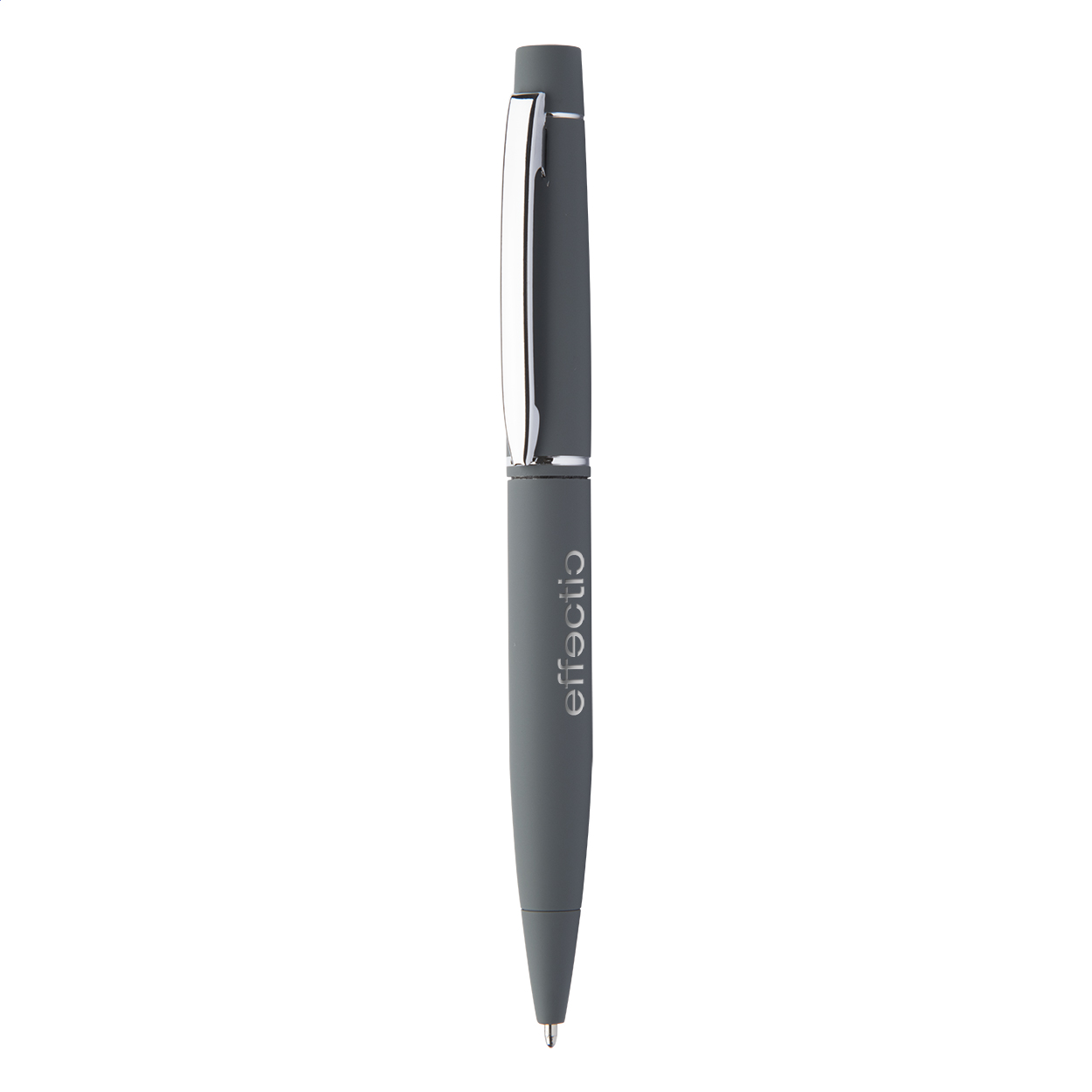 Drehkugelschreiber aus Metall mit gummierter Oberfläche und Spezialbeschichtung für eine Spiegelgravur, blauschreibend.