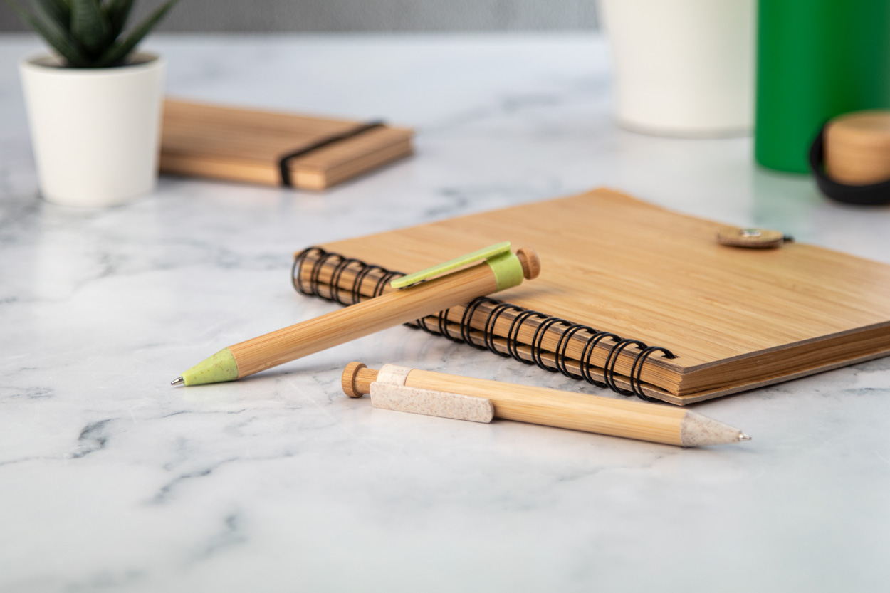Bambus-Kugelschreiber mit Teilen aus ökologischem Weizenstrohkunststoff, blauschreibend.