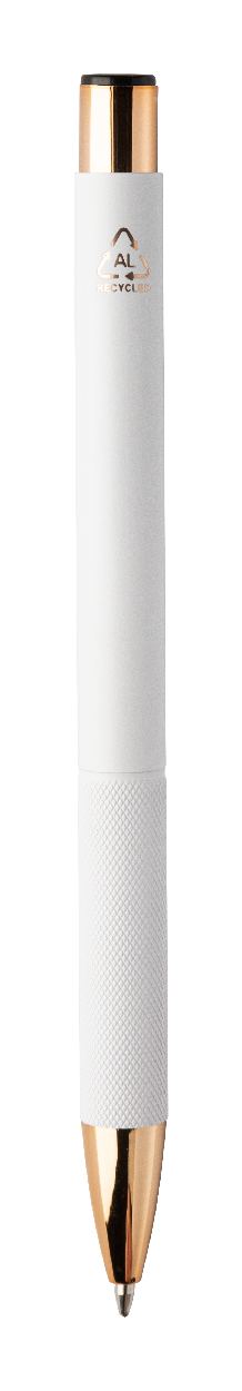 Kugelschreiber aus recyceltem Aluminium mit mattiertem Gehäuse, strukturiertem Griffstück und Roségold-Details, blauschreibend. Mit Spezialbeschichtung für Spiegelgravur in Roségold.
