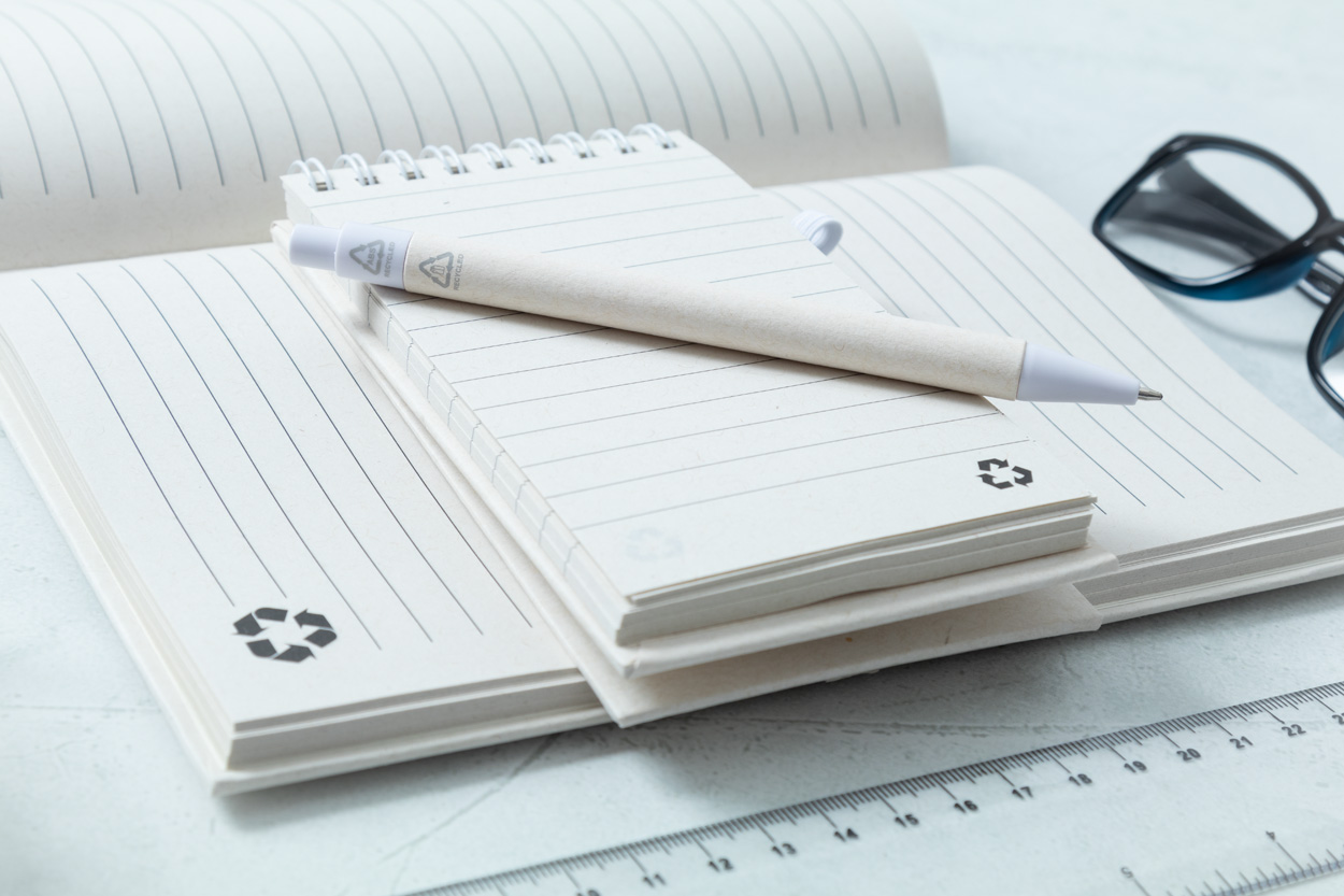 Kugelschreiber aus recyceltem Milchkarton mit Elementen aus recyceltem ABS Kunststoff. Blauschreibend.