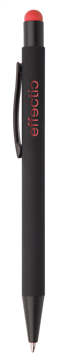 Aluminium-Kugelschreiber mit Touchpen und gummierter Oberfläche und Spezialbeschichtung für eine Farbgravur (Gravurfarbe abgestimmt mit Stylus), blauschreibend.