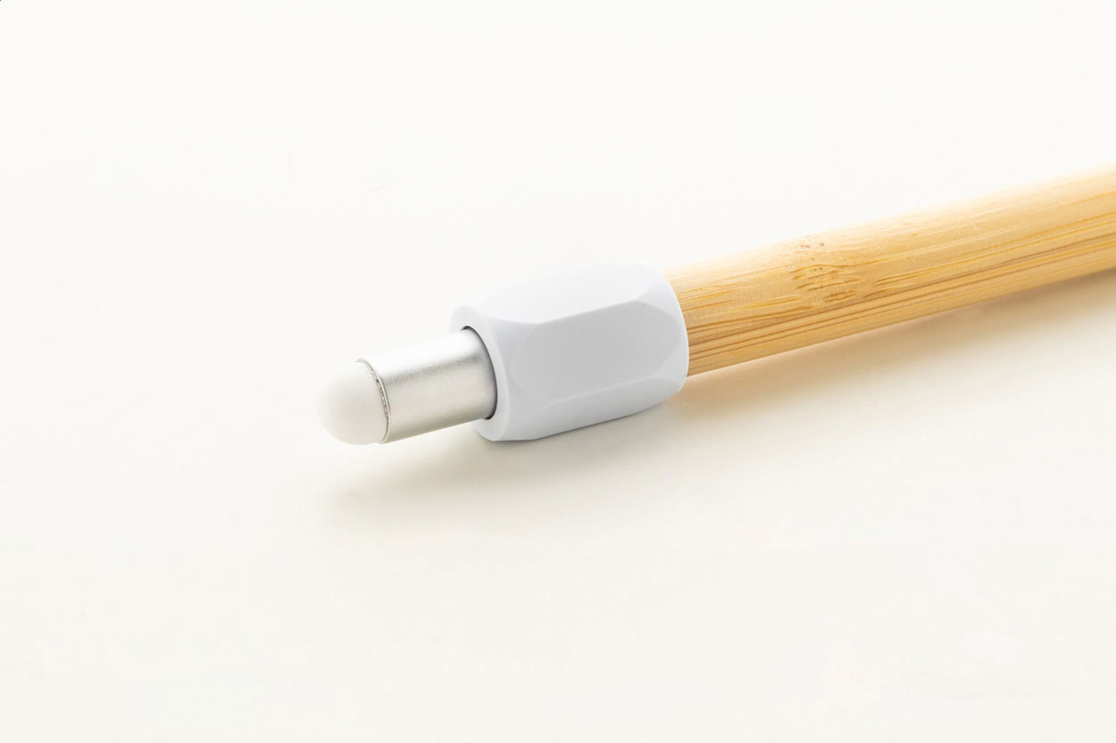 Kugelschreiber aus Bambus mit Touchpen und Fidget Spinner aus recyceltem ABS Kunststoff. Blauschreibend.