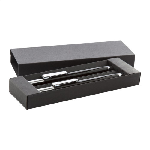 Aluminium-Schreibset, bestehend aus Kugelschreiber (blauschreibend) und Druckbleistift (0,7mm). Einzeln in schwarzer Geschenkbox.