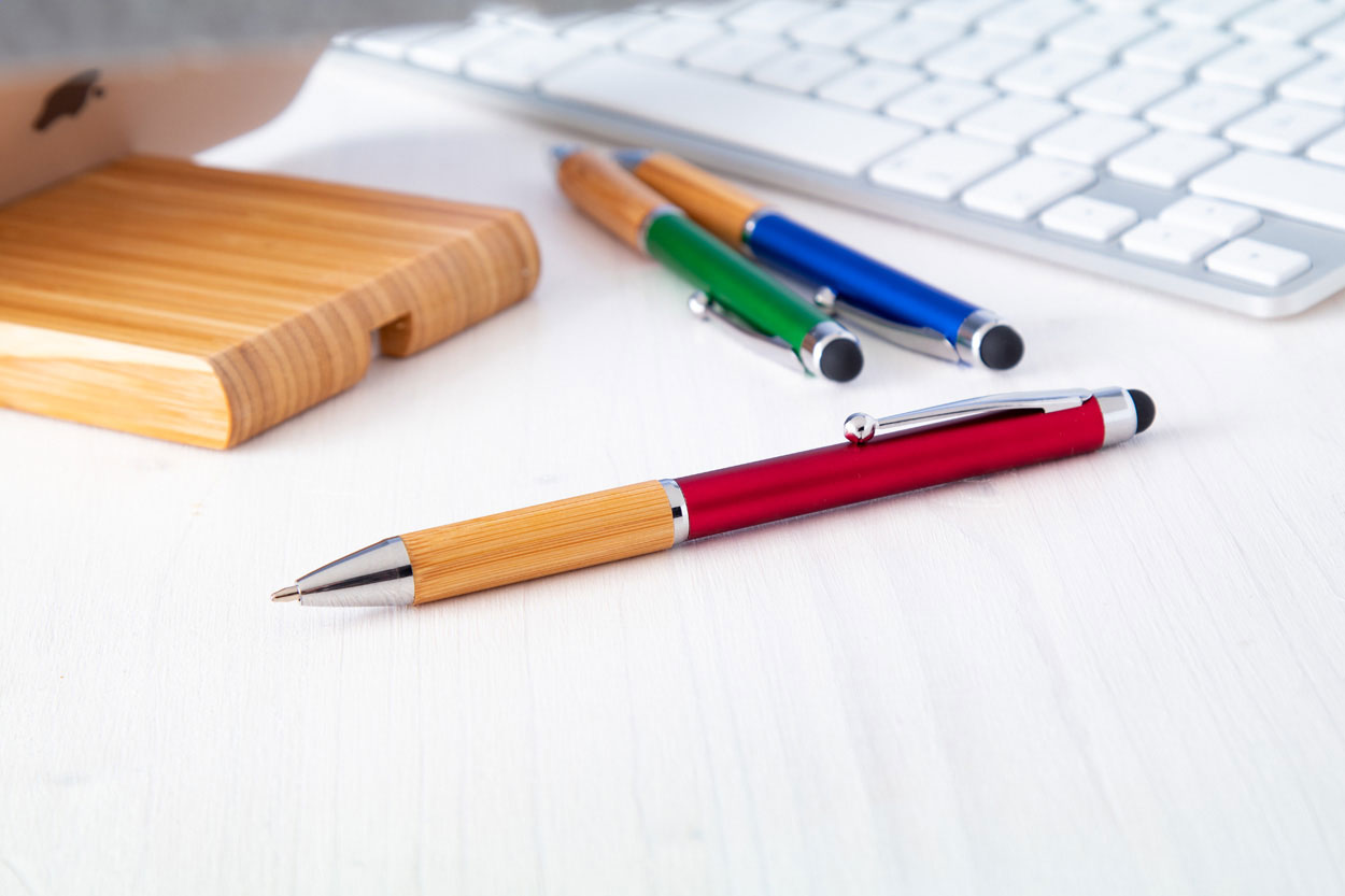 Dreh-Kugelschreiber/Touchpen mit Bambus-Griffzone, Schaft mit Metallic-Oberfläche und glänzenden Chrom-Elementen. Blauschreibend.