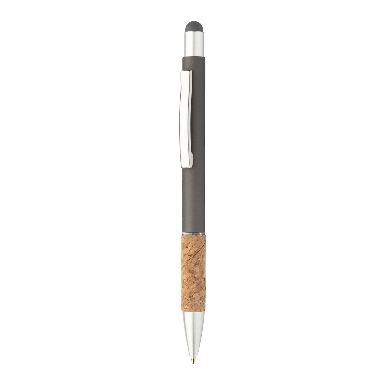 Kugelschreiber/Touchpen aus Aluminium mit Griffzone aus natürlichem Kork und matter Oberfläche. Blauschreibend.