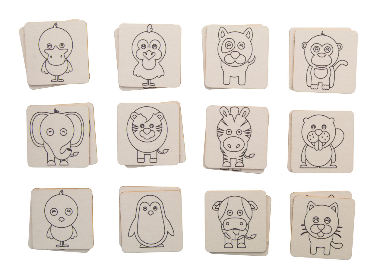 Memory-Spiel zum Ausmalen in Baumwolltasche. Enthält ein thematisches Memory-Spiel aus Pappe (24 Teile) und Holzfarbstifte (12 Stück) in einer Pappschachtel.