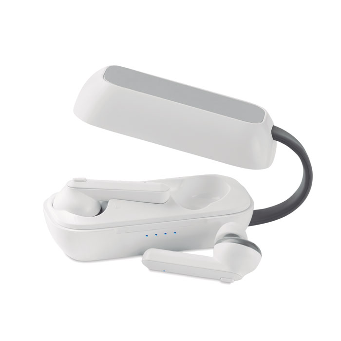 TWS 5.0 wireless Ohrhörer-Set. Inkl. eingebauter 30 mAh Batterie und Mikro-USB Kabel. Lieferung in einer 400 mAh Box, die gleichzeitig als Ladestation dient. Spieldauer ca. 3 Stunden.
