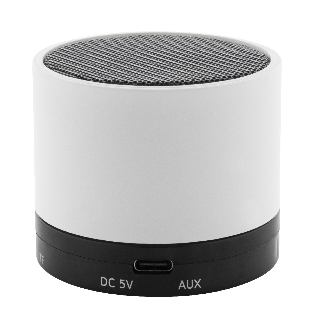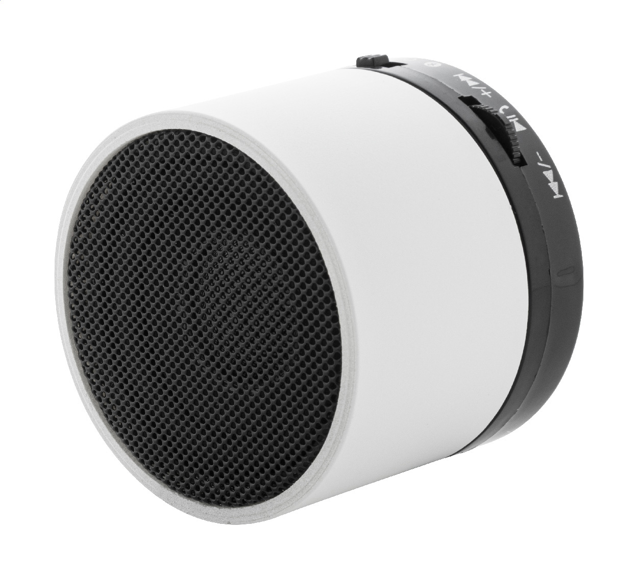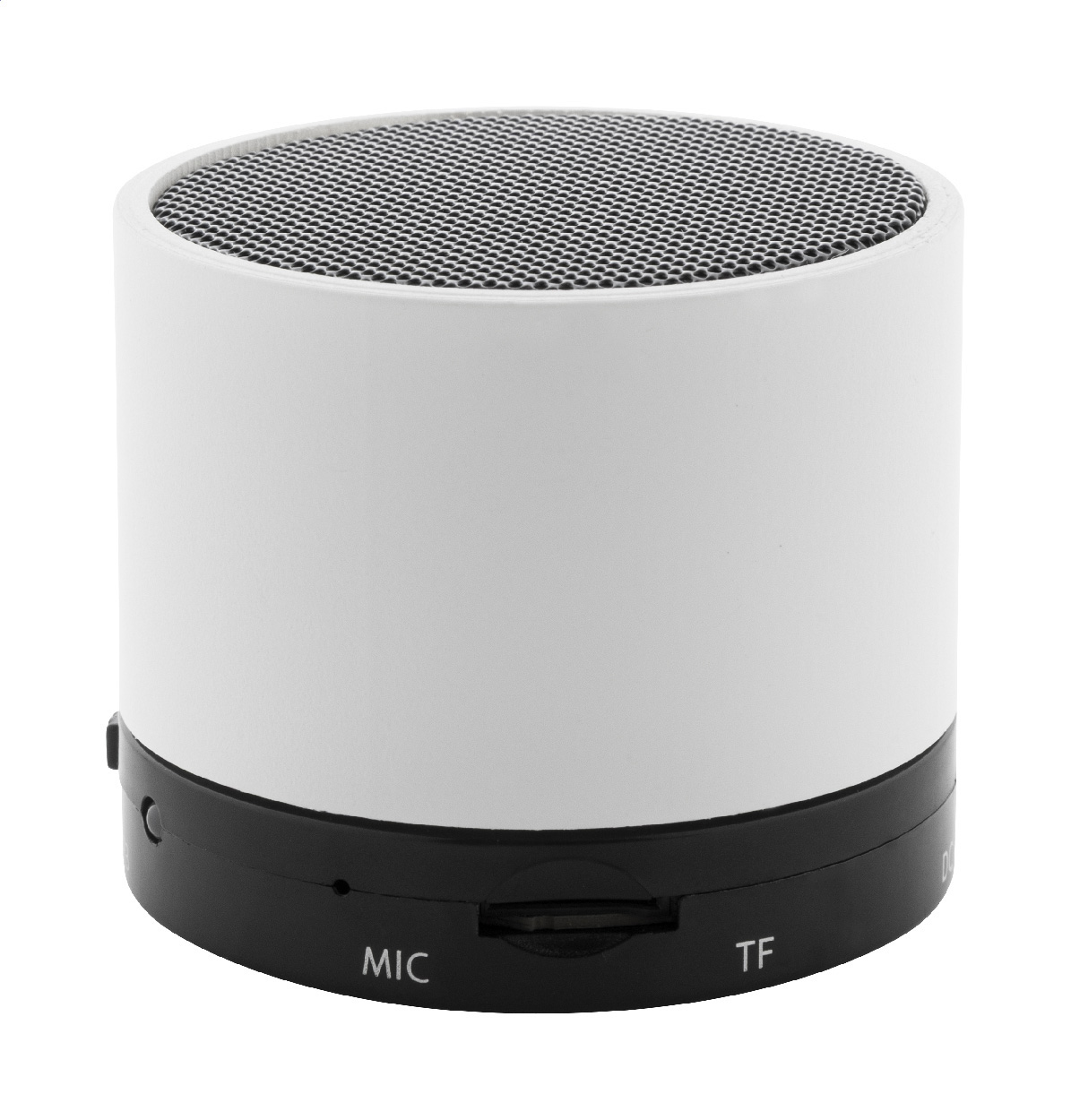 Kabelloser Lautsprecher aus recyceltem ABS in gummiertem Gehäuse mit Metallgitter und wiederaufladbarem Akku (300 mAh). Mit Freisprechfunktion und MP3-Wiedergabe über Micro-SD-Karte. Inklusive USB-Ladekabel.