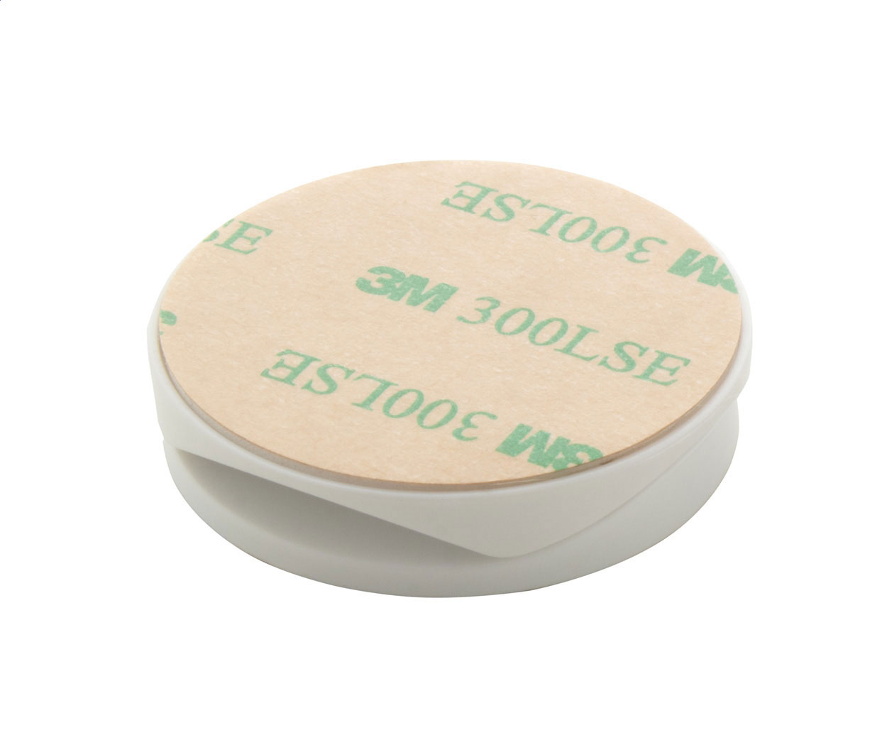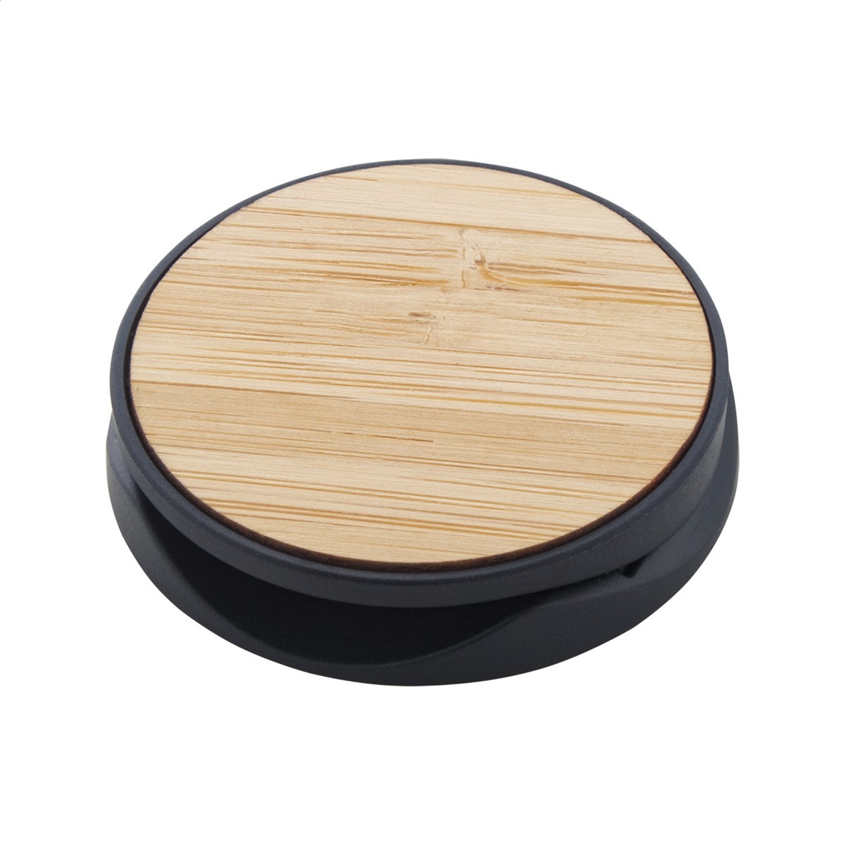 Runder mit Bambus beschichteter Handyhalter aus Kunststoff, mit selbstklebendem Sockel.