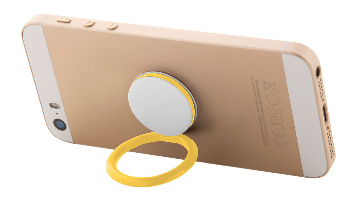 Runder Handyhalter aus Kunststoff mit selbstklebender Rückseite.