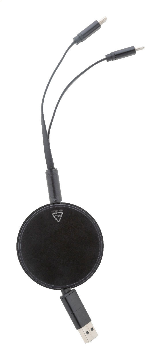 Ausziehbares USB-Ladekabel aus recyceltem Aluminium mit Mikro-USB, USB-C und Lightning Steckern sowie USB und USB-C Buchsen.