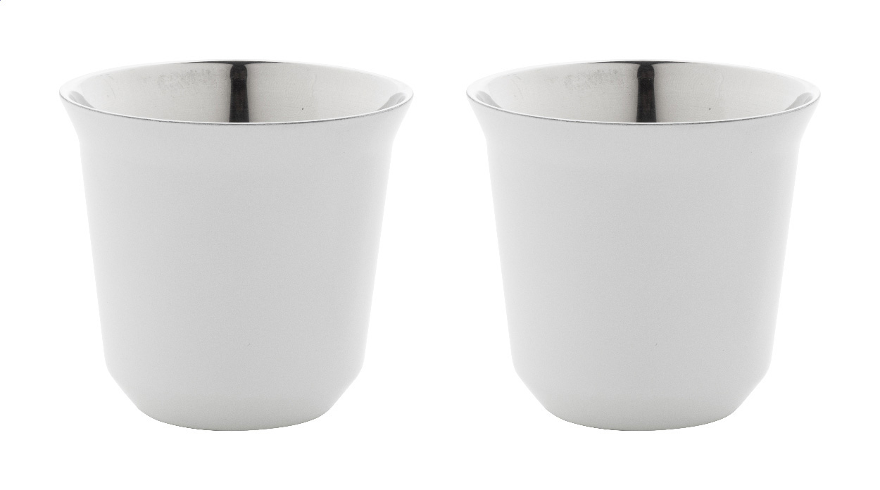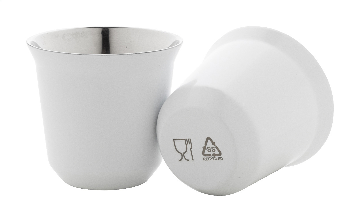 2-teiliges Espressotassen-Set mit doppelwandigen Thermobechern in Form eine Kaffeekapsel aus recyceltem Edelstahl. Füllmenge: 80 ml. Einzeln in Kraftpapierbox.