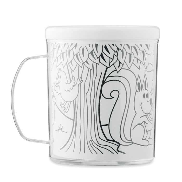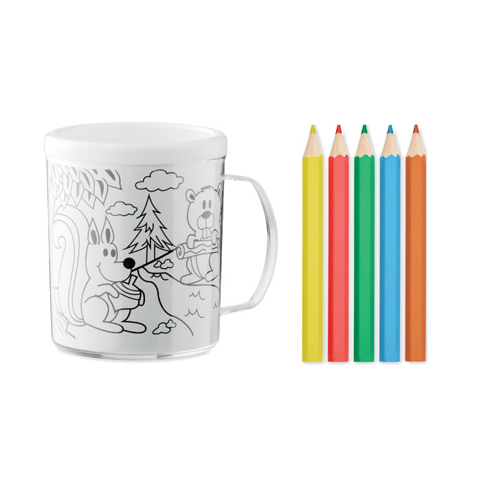 Becher aus PS. Inkl. 5 Buntstiften und 4 Malvorlagen aus Papier, die in den Zwischenraum des Bechers eingelegt werden können. Füllmenge: 280 ml.