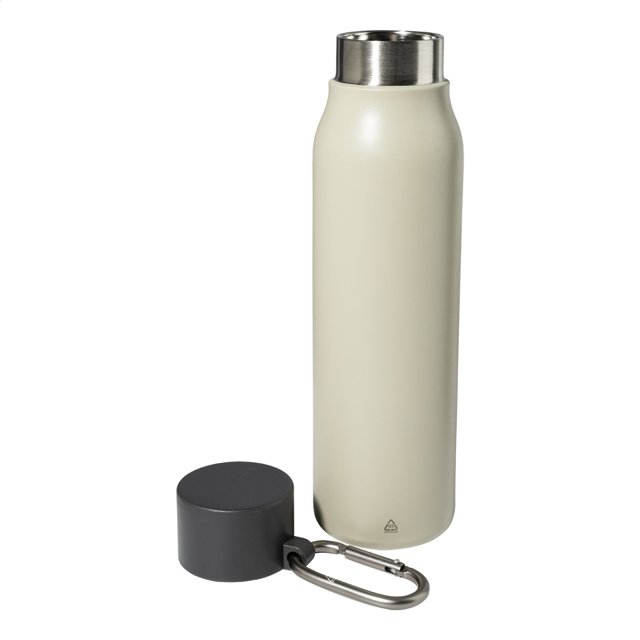Doppelwandige, isolierte Vakuumflasche aus recyceltem Edelstahl mit PP-Deckel und Karabiner aus recyceltem Aluminium. Füllmenge: 500 ml.