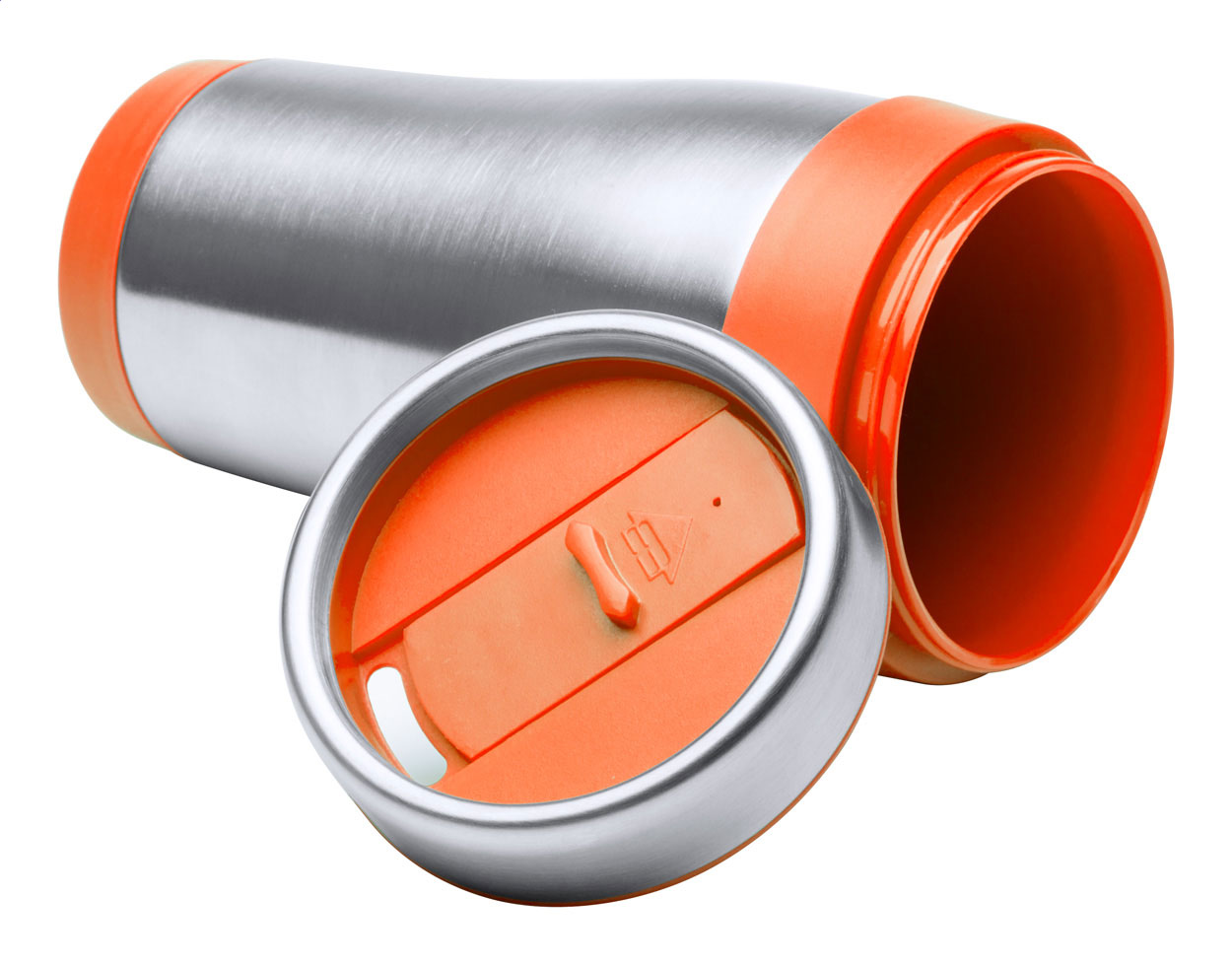 Doppelwandiger Thermobecher aus Edelstahl mit farbigen Kunststoffteilen. Füllmenge: 450 ml. Einzeln in Geschenkbox.