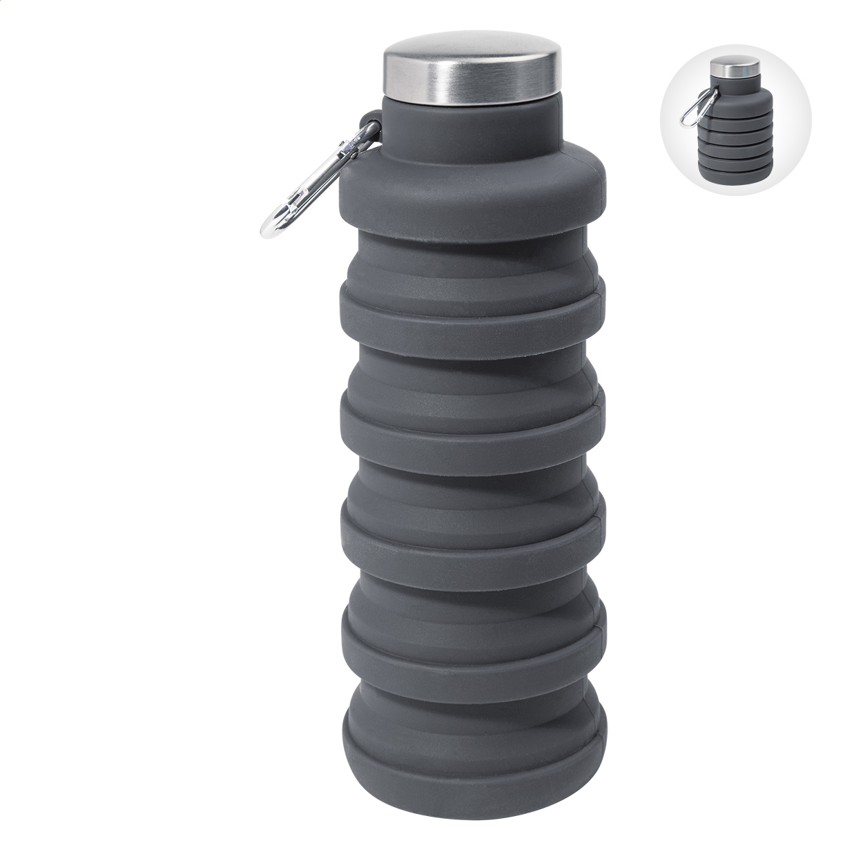 Faltbare Trinkflasche aus Silikon mit Deckel aus Edelstahl und Aluminium-Karabiner. Füllmenge: 500 ml.