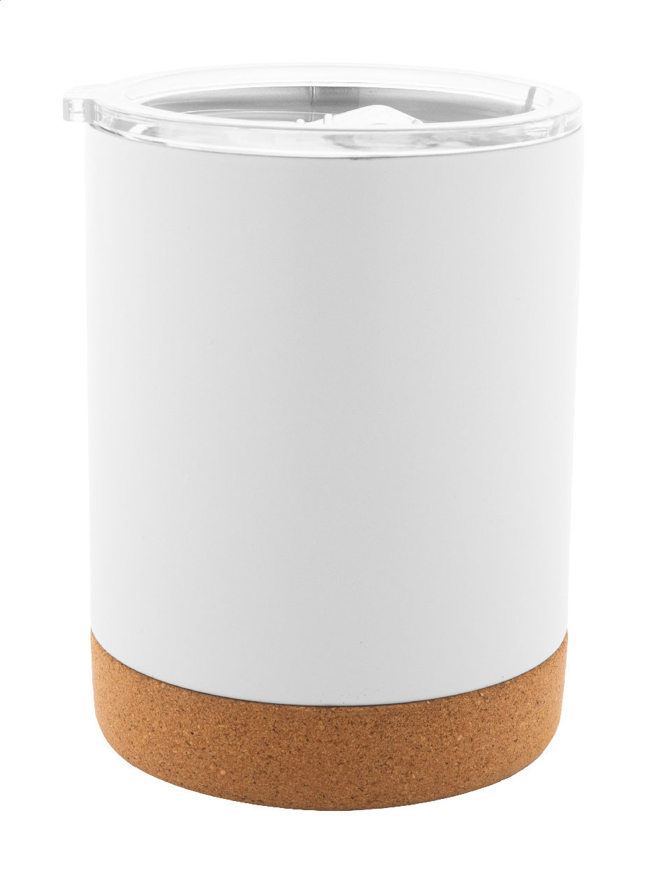 Doppelwandiger Thermobecher aus Edelstahl mit Trinkdeckel und Fuß aus natürlichem Kork, einzeln in Kraftpapierbox. Füllmenge: 330 ml.